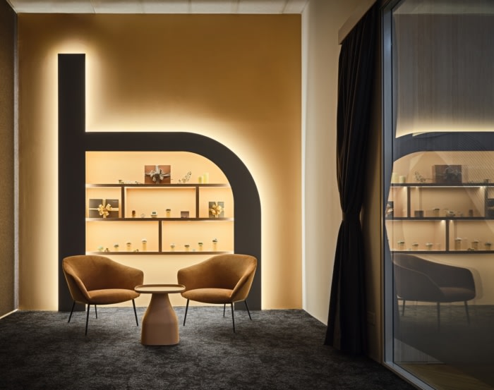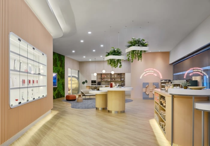 Hegen’s pastel hues and distinctive “sqround” shapes form a key point of inspiration, which is carried into the space through curved walls, tactile materials and strategic use of light. A feature wall wrapped with timber batten leads visitors around and anchors the various zones, lending warmth and texture to the space at the same time.