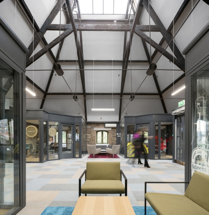 Heineken International acquired the site in 1983. The Malt House, built in 1890, today houses the offices of the brewery. Following on from creating new Heineken offices in Dublin, MDO were asked to look at the refurbishment of the Malt House. This involved a full assessment of the building from both a workplace strategy and conservation viewpoint. The building had numerous floors with low ceiling heights used originally for spreading out corn for malting. MDO built a full BIM model, showing where there was poor flow through the building and whole floors were underutilised. This resulted in the radical proposal to remove an entire floor. This creates a dramatic new double height office between the first and second floors in the central section of the building. This space is extended to form the new reception area in the new heart of the office and brought the customer service teams back into the heart of the workplace from an adjacent building.