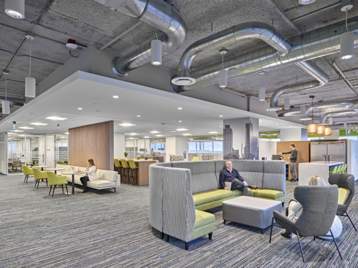 A combination of technology and wellness programming work together to create a work environment that’s not only functional but encourages collaboration among employees in a post-COVID workplace. The design supports multiple work modes for team members including areas for focus, collaboration, learning, socializing, and wellness.
