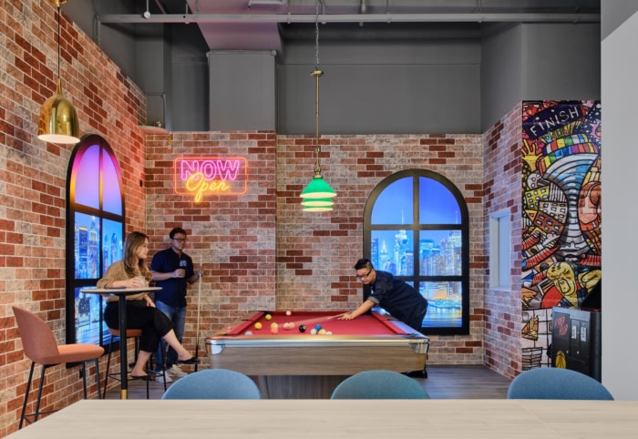 Adjoining the Communal Workspace is the IDI Bar. Voted fondly as the favorite space by the staff and management alike, this stylish wine and snacks area adopted the character of an English Bar. Furnished with the Chesterfield sofa set, circular whiskey display cabinet, a 20 feet dining table, pool table, dart, and basketball machines, little wonder this area is the jewel of the office.
