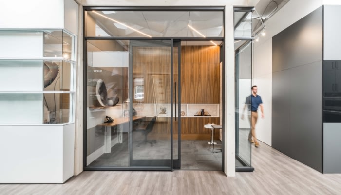 Ceilings are open and exposed with angled timber beam feature which frame and bring interest the larger central space. Five digital display stations were developed that provide either a social, meeting or focused workspace where teams collaborate to create unique design solutions. A working showroom that provides an inspiring backdrop for planning, collaborating, socializing, creating and building for real life.