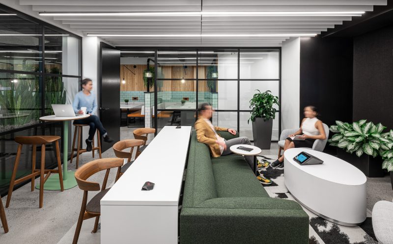 Flexibility is at the core of the layout, allowing for the space to adapt and transform based on the needs of the team. A large social space on the 20th floor features cool mint tiled walls and large harvest tables alongside booth seating; reminiscent of urban eatery. The environment feels very chic, while still providing a casual, comfortable atmosphere. The smooth, polished concrete floors and white walls are set against biophilic elements and rich textiles in browns, greys and greens that add warmth and dimension to the space. Large glass panels divide the floorplan into various zones, while still allowing an abundance of light to penetrate the interior zones.”