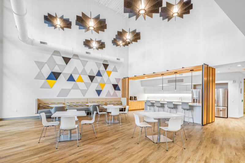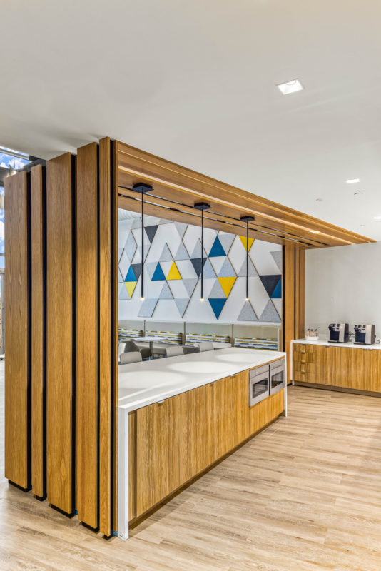 “The updated sales office sits at the cutting edge of flexible workplace design, featuring unassigned seating as well as a variety of settings to accommodate various individual modes of working. To strengthen both personal relationships and overall company culture among staff, FCA implemented a town center to facilitate connections; whether through formal ‘Town Hall’ meetings, company celebrations, or casual get togethers over a cup of coffee.