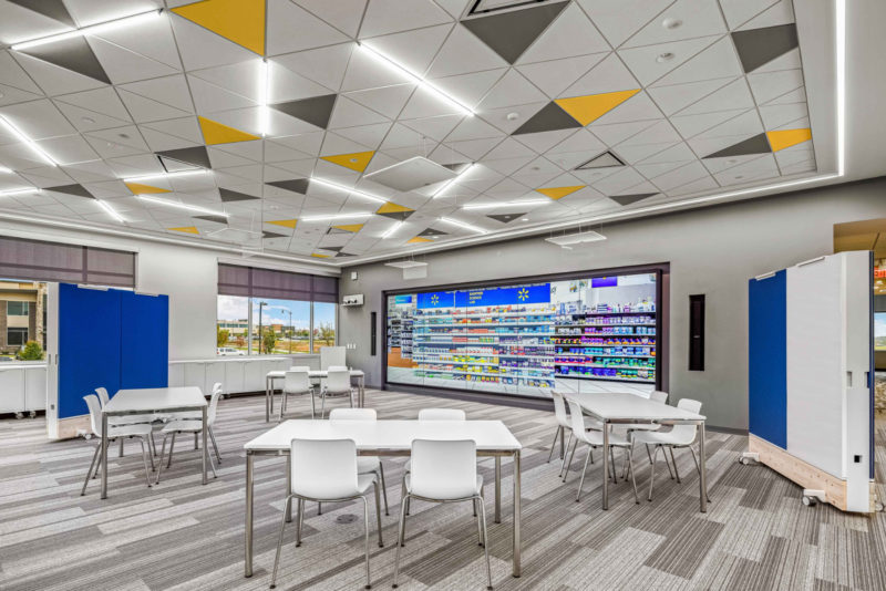 Another key component of the renovation is the Consumer Innovation Science Center, also known as the “Shopper Science Lab.” GSK required a space where they could more adeptly engage clients with real-time consumer insight assessments. The Consumer Innovation Science Center consists of several different collaborative environments, offering various ways for the organization to engage with clients. The “Spark” ideation room is the largest individual space in the center and incorporates a 7-by-15 foot interactive touchscreen. Digital consumer product displays are prototyped and tested in this multi-purpose “Spark” room, which is specially outfitted with flexible furniture to enable a multitude of engaging settings––from classroom-style seating, to town hall meetings, brainstorming sessions, and exhibit space for physical product displays.