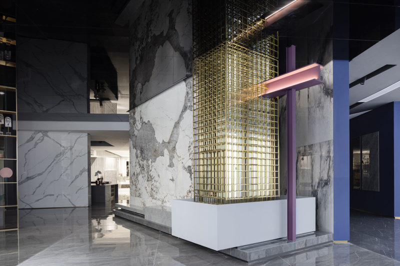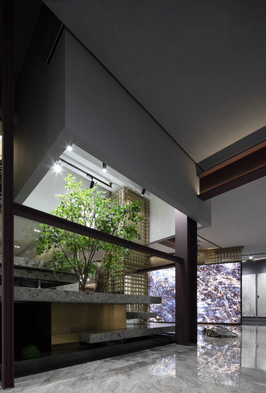 The 3 columns of different sizes in the space seem to gradually peel off the coverings of the building, creating strong visual effects and leading people into philosophical thinking: What is real perfection?The design emphasizes the collision among materials of different textures. Polished terrazzo, exquisite marbles and rusting universal beams, either smooth or rough, cool or warm, are applied to constructing the space by means of contrast, analogy, symbiosis, repetition and order, etc. The column at the center is integrated with metal, aluminum and glass to form a new architectural and visual element. Such combination embodies an exploration of sustainable materials and an inheritance of modernism. Design is more than superficial decoration, but more importantly should explore and bring more possibilities of internal reconstruction,” says Foshan Topway Design.