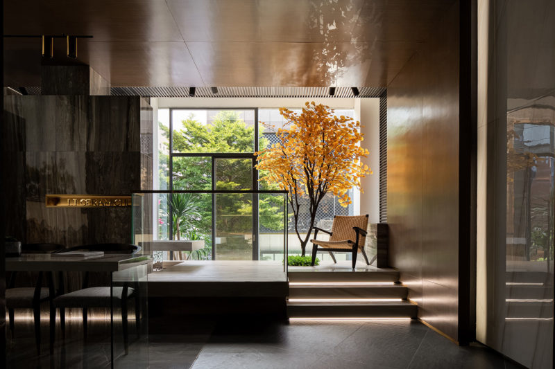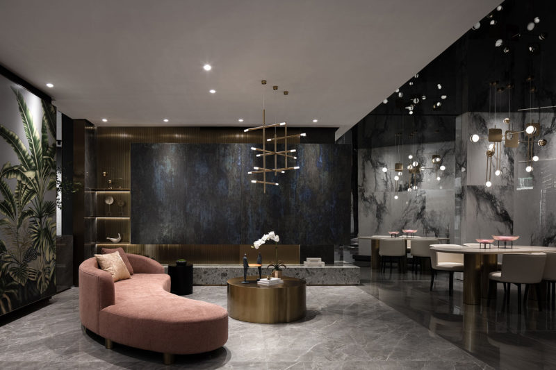 The concept of “Cube” is extended to the interior design, which creates free yet contrasting spatial forms. At the lobby, the ceiling is finished with a stainless steel panel featuring rippling patterns, which create a feeling of being underwater. The rotating wall and ceiling are connected and interpenetrated via blocks, giving the space a strong sense of architectural blocks. The luxurious pink stone and the cement-like flooring form a sharp contrast, while accentuating their own unique textures. Visitors can appreciate different views at each step along the circulation route. The core of this free space is that it never restricts people’s behaviors. Instead, it guides them to walk and explore under the “rippling water”. The poetic design language enables the architectural space to resonate with inner mind.