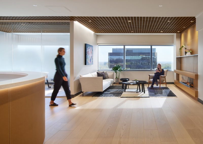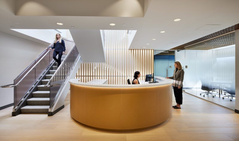 The lobby is warm and textured. The materials and curved geometry of the new desk amplifies the existing stair, while the new wood vertical element at the stair highlights the light coming from the skylight and softens the stair. The fireplace is modern and sets a cozy, comfortable vibe to the lobby. The details, colors and textures are fresh and inviting. Clients coming to the office will feel at ease in the space.”