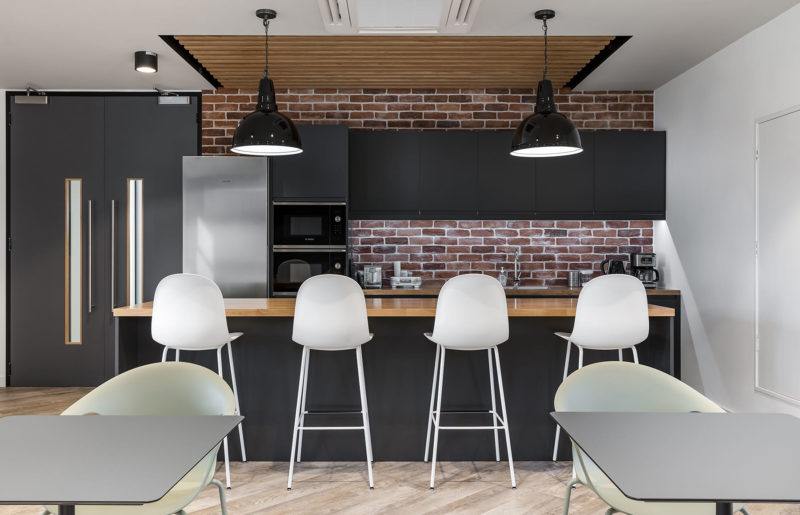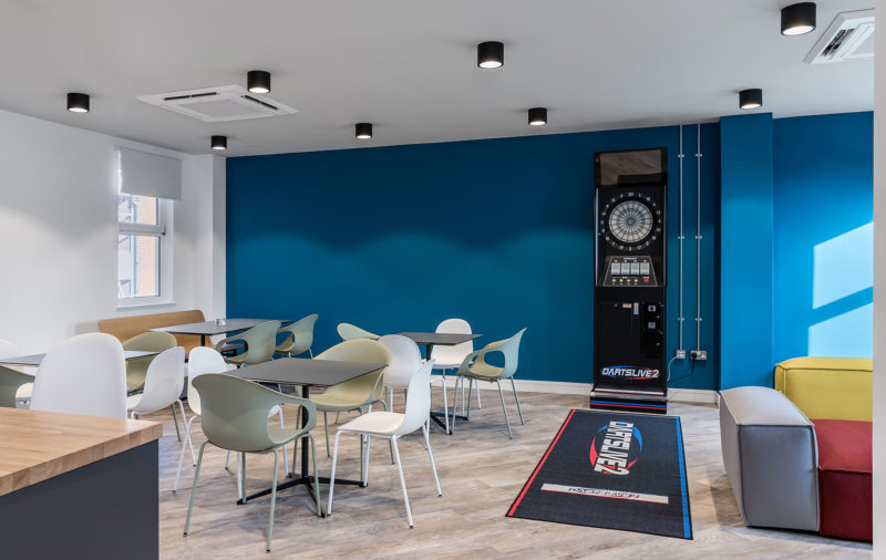 The resulting studio features Two Point Studios branding throughout, with a full wall graphic displaying some of their characters and feature walls in their brand colours. Staff now have plenty of breakout spaces including game areas and a café where they can take time away from their desks. With four-times more meeting rooms than their previous space, the new workspace is equipped for Two Point Studios’ continued expansion,” says Oktra