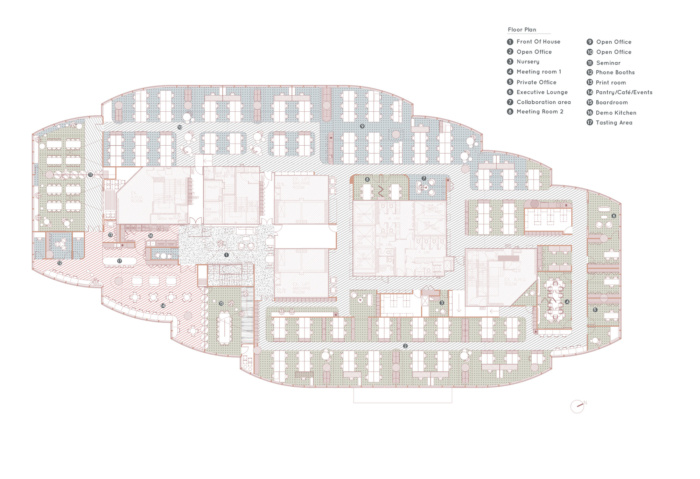 On the upper floor landing, social furniture and collaboration booths are spread around the stairwell to encourage interaction between users. A red ceiling mesh system casts water ripple-like shadows onto the furniture, with the tasting kitchen and tasting room in the backdrop subtly divided by translucent glazed partitions.