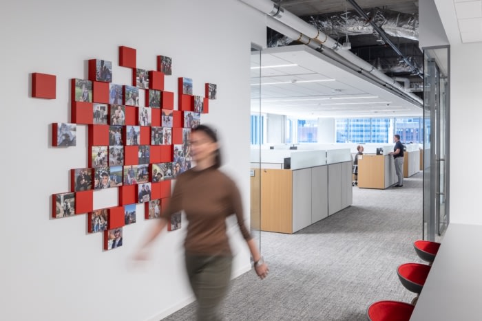 The office portion of the suite was designed to reinforce the brand while maximizing the idea of choice and wellness. NELSON prioritized natural light throughout the office to reflect a bright and open feel. Universal-sized private offices are positioned on the interior, leaving highly coveted collaboration zones and privatized conference spaces along the window line. By integrating JLL’s branded red colors into the warm and bright space, brand identity is seen throughout the office in a subtle and non-overwhelming way, creating an elevated look and feel. The overall office environment exudes a pulse and energy that is bold and sleek with graphic contrast, warm gestures, and a polished finish.