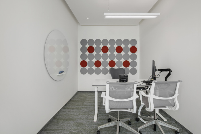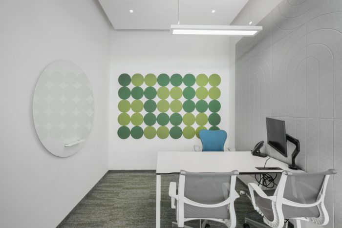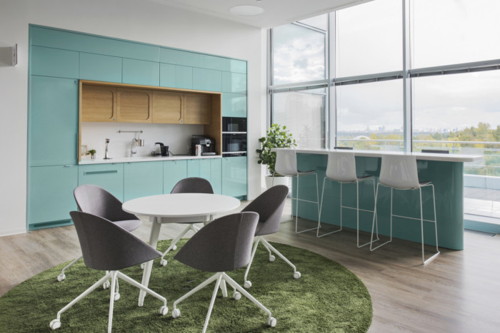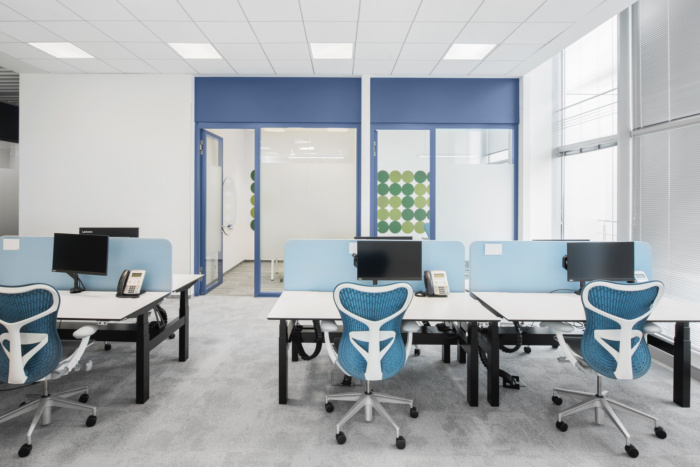 Workstations are equipped with lifting gears with electric drive, allowing you to adjust the height of the table for comfortable work, and ergonomic chairs. There were used environmentally friendly materials, and electronics has passed the ENERGY STAR certification. To ensure acoustic comfort customized acoustic panels with individual design have been installed on every floor.