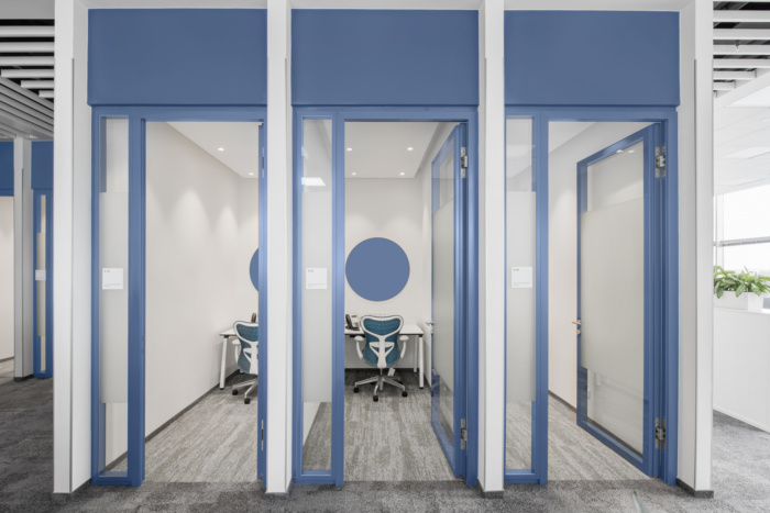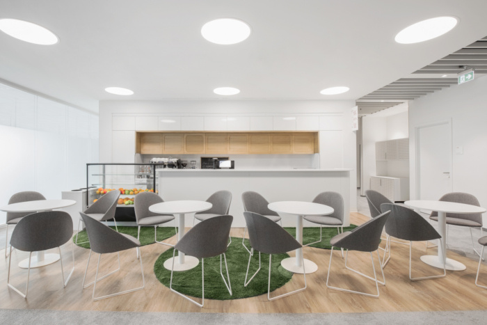 Also there are a special healthcare room, a yoga room equipped for sports, and a recovery room for relaxation and rest. Employees can use showers on each floor of the office and many bicycle parking on the territory of the business park.