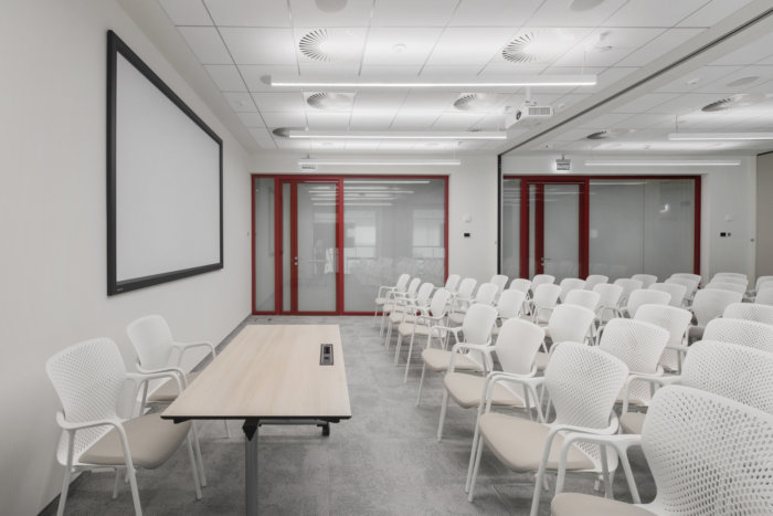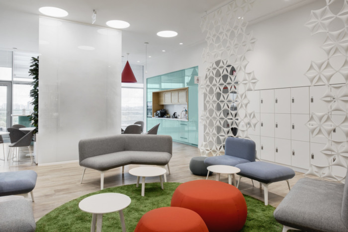 The new Johnson & Johnson office follows the latest international trends in the field of interior design and work organization. The office has received the international LEED Silver certificate. There are no workspaces or offices assigned to employees; instead everyone gets a locker and a basket for personal belongings. Employees can efficiently organize their work with the help of a flexible conference room booking system, teamwork areas, multiple rooms for phone calls and quick meetings, and spaces for individual work. Four large meeting rooms can be transformed into a conference room for 120 people using the mobile acoustic partitions.