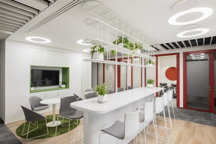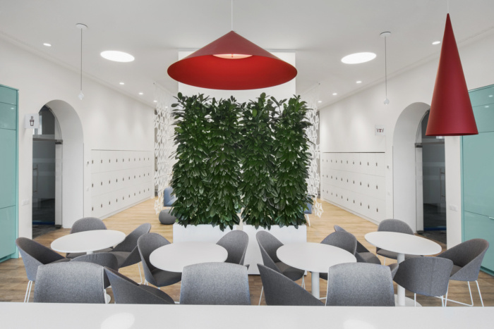 The light colors of the office are complemented by bright accents of red and blue – corporate colors of Johnson & Johnson. Mint color is highlighted in the dining areas, as well as shades of light wood. Green color is located both in greening and in interior details. There is a wall of stabilized moss behind the reception desk, which immediately attracts the attention of visitors.