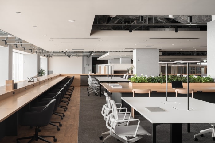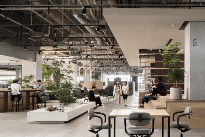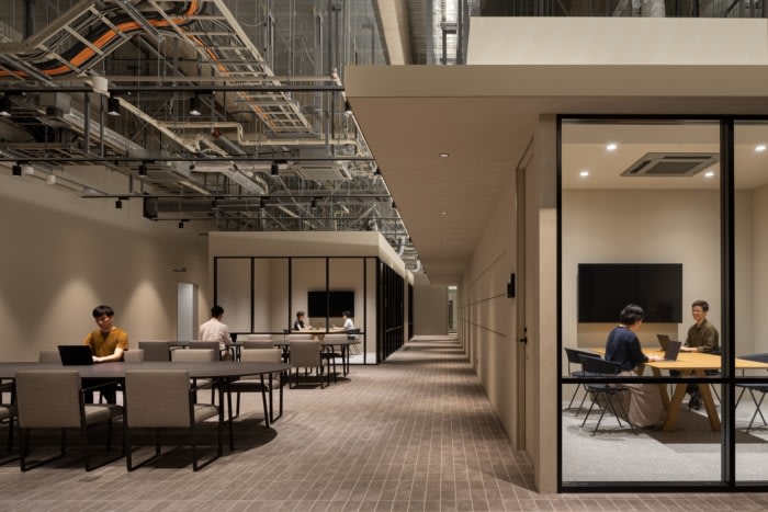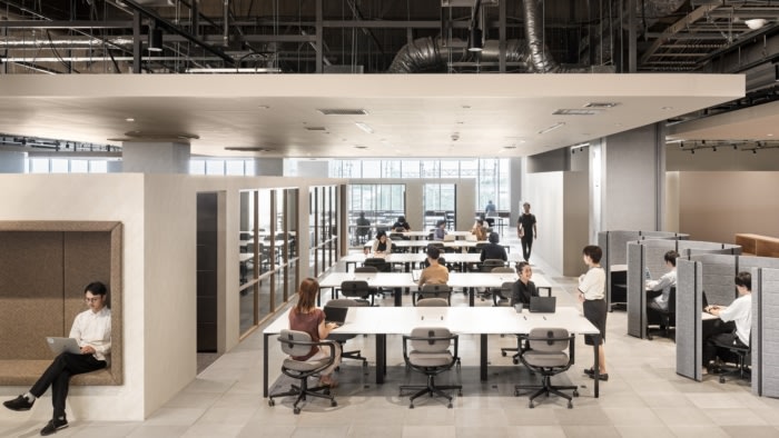 The design brief was handed to Flooat Inc, which came up with the idea of ‘fluctuated landscape’. Taking the entire 9000㎡ floorspace as one continuum – a single area without walls or divisions – they introduced randomly varied ceiling heights with occasionally exposed structural elements. This generated a vertically-oriented variety. Some of the lower ceilinged areas are defined as ‘intensification zones’, for concentrated and individual work, while others with higher ceilings are named ‘relaxation zones’ and where creative inter-communication is encouraged. The complete Campus brings together the atmospheres of these diverse and differentiated zones, so as to build a totalised harmony.