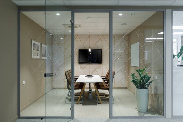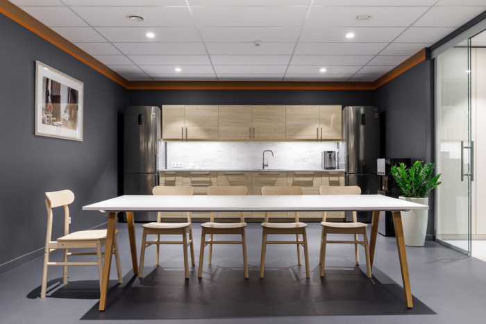 DESIGNIC has created an office that offers comfortable conditions for all employees. We offered to the client two options of the color palette: the working areas and meeting rooms have a more neutral color tone to promote concentration and lounge and common areas in contrasting deep shades. In lounge zone color accents are introduced with the bright items of minimalistic furniture and carpet tiles, and the canteen is finished with a glass partition to maintain the feeling of openness set out in the workspace of the office.
