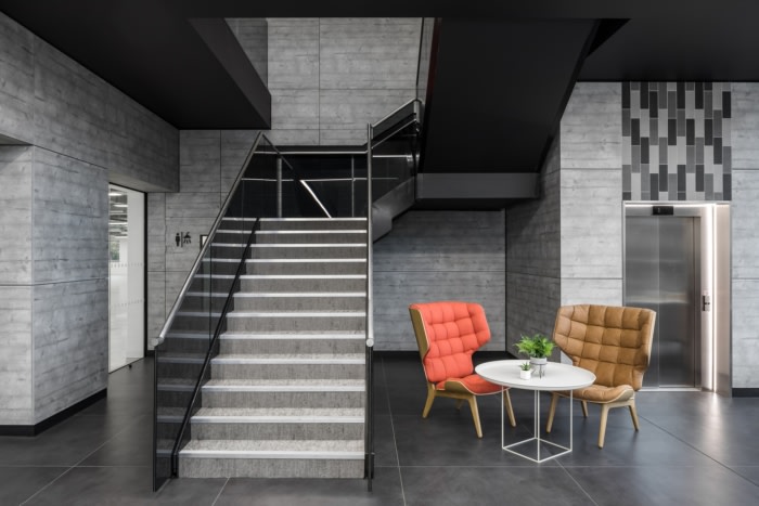 The entrance to The Link is designed to make a striking first impression, with a vast glass wall opening the reception up to the outside, and a sleek, floating stair design that spans the double height space. Oktra stripped the existing floors back to shell and core before completing a Cat A fit out of the entire building. This process involved re-engineering the space by installing new floors, ceilings and mechanical and electrical systems. The ceilings have been left exposed on the second floor to maximise floor height and natural light.