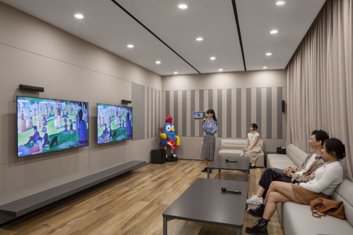 Additionally, all necessary facilities are available onsite. There are rooms for live streaming, makeup, broadcasting and recording. A palette of materials supports acoustic comfort and improves the overall audio experience.