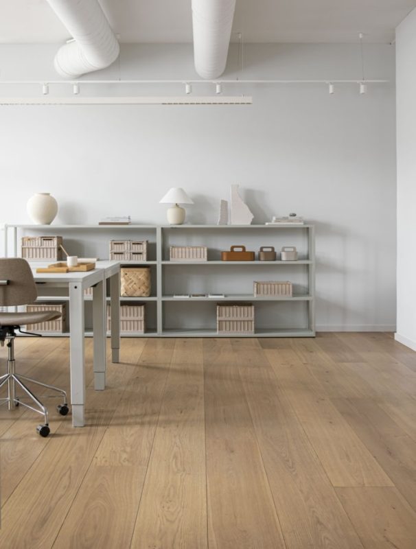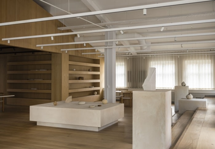 Moreover, we designed bespoke podiums covered with clayworks to create small moments within the showroom. By keeping the colors tone-in-tone in a light grey nuance, we create a contrast to the warmth of the wood.