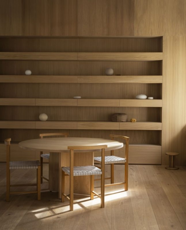 The showroom in the middle of the building stands as an artefact from the industrial age – an old production hall with open areas, architectural columns, and an iconic skylight. Although the space was beautiful and almost iconic as it was, humans instinctively search for spaces that make the body feel bounded and centered, that incite a sense of safety and comfort, and encourage activity and thought. In architecture, we must therefore work with scale, fullness and emptiness in a way that embraces the human form. Hence, to create a space that feels comfortable and relates to the body, we’ve designed a wooden core, serving as a small-scale house within the space to make it more relatable and easier to inhabit.