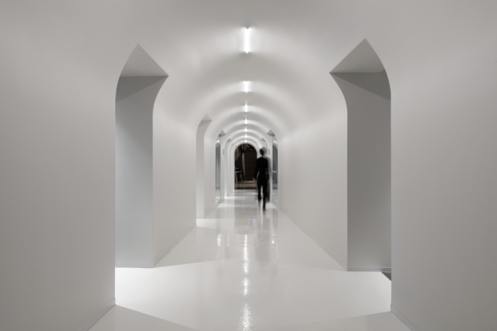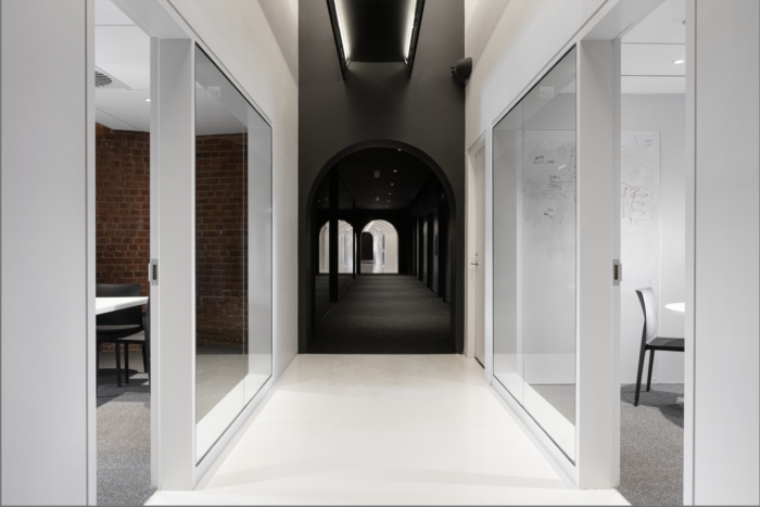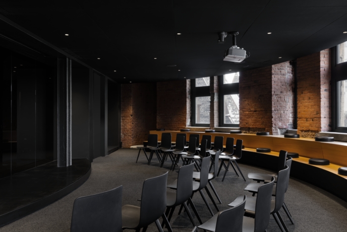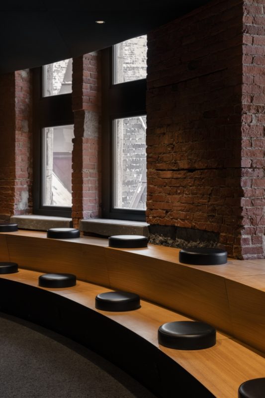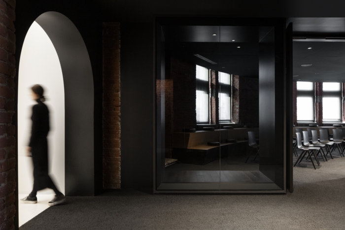 Completed in January 2020, ACDF rose to each and every challenge along the way in order to effectively and efficiently transform the space into an architectural journey, rich in contrasts and experiences. Bold contrasts in lighting and color embody the firm’s approach to creating desired moods and highlighting spatial transitions. Upon exiting the 5th-floor elevators, a dark environment lends itself to a subtle game of transparency and reflection, courtesy of three bronze-tainted boxes delimiting the elevator hall from the adjacent training room. The elevator hall’s black background immediately contrasts with the warmth of the training room’s white oak bleachers, and the rich texture of its exposed brick wall. To the east and west of the elevator hall, the firm’s approach to transitional contrasts emerges in the form of bright white geometrical corridors. The passages accentuate a transition between the cavernous dark zone and the enveloping, residential ambiance of exposed brick walls and wooden beams that characterize the company’s meeting rooms, services core, and unique workspaces located at each end of the corridors.