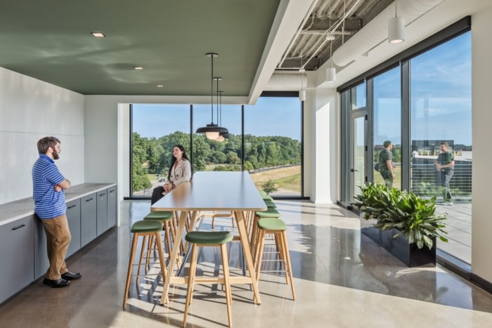 Amenities are a key component to help build a sense of community and allow workers to find alternative working environments. A large café provides a variety of seating postures for eating, gathering, or working. A series of four terraces offer the opportunity to remote work in the fresh air. Satellite coffee points, phone rooms, focus rooms, and war rooms also offer employees numerous options away from their desk to focus, collaborate, or share a coffee with a coworker.