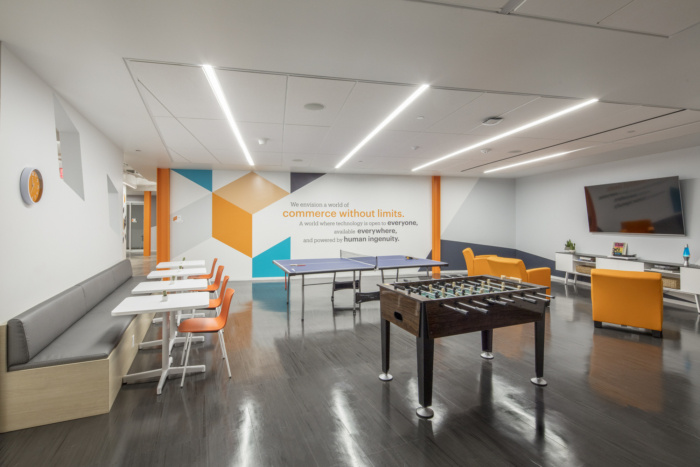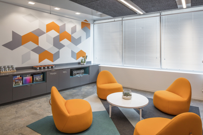 The Magento bar and break area contribute to the open flow concept. The open window between the bar and the break room island abstractly reflects the Magento ‘M’ and allows for interaction from all sides. The feature facilitates the continued flow of employee interaction, and continuous view. The open break room area offers the flexibility for both work and play. The area was designed to accommodate everything from all hand’s meetings and company-wide happy hours, to impromptu team-building game time, and independent work space.