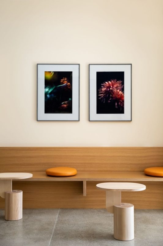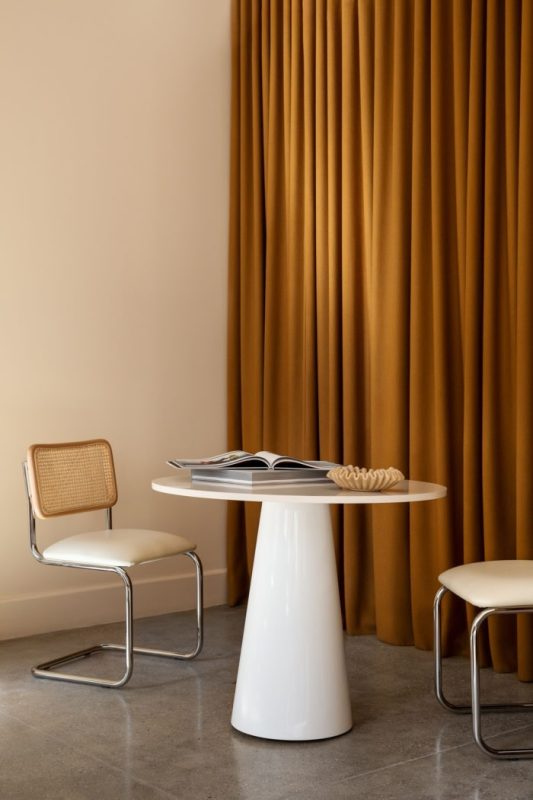 Mama Tress is a New York City boutique branding and marketing firm with a focus on all-things hair. We used clean lines and sharp edges throughout the space softened by materials with warm neutrals and light wood finishes to create a mindful workplace. This project is defined by a tone-on-tone interior with defined saturated areas and layering. We chose the color Mystic Beige for the walls to create a luminous and immersive experience that changes hues throughout the day. To add depth and layers, we used millwork with exposed edge plywood and ripplefold drapes for shadow. With an open office concept and private zones, the company is able to remain flexible fluid.