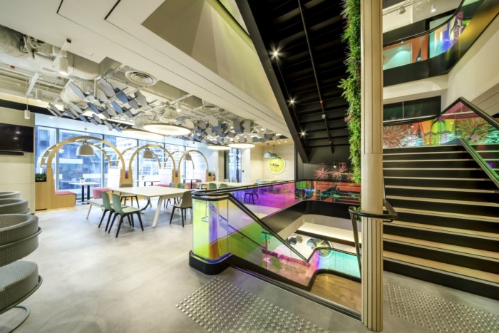 An omnipresent driver of every decision, it is reflected in gestures such as the dichroic treatment of the staircase glazing that divides the light in hues of pink and green, or in the ceiling wayfinding that branches out from the building core and declutter the signage at eye level.