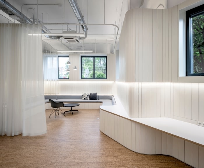 White vertical-slatted pinewood cladding, with a rough finish, lends a distinct and powerful material character to this enclosure. This material configuration confers continuity to the curved shapes of the furniture, and a tangible nature midway between industrial and domestic, while the white paint affords considerable luminosity. The continuity and material warmth of the wood is reinforced by a smooth cork flooring. Natural materials were chosen not only as part of a sustainable action strategy, but also to enhance the space in terms of touch and acoustics.The contours and materials contribute decisively to the acoustic absorption and dissipation required in such a space, without the need for additional ceiling elements. Facilities are therefore left exposed, giving them a certain industrial character, creating an interplay with the reflections of the upper aluminum envelope. The high-quality and warm furniture pieces are incorporated as an integral part of the project, providing colour counterpoints and reinforcing the domestic contrast with the industrial materiality of the bare facilities.