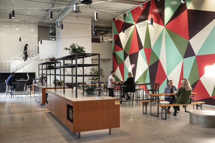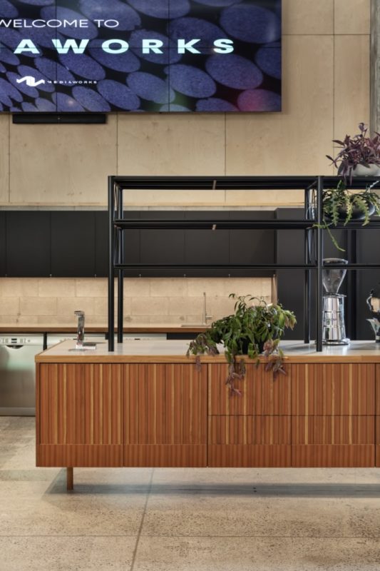 The fit-out looks as much to the past as the future, inspired by music as a soulful medium that brings people together and reflects a nostalgic love for old and new. The journey of sensation begins in reception and pulses through the fitout where the predominately concrete and steel aesthetic is contrasted by soft absorptive materials, retro timbers and finishes and joinery that take their expression from music – a futuristic speaker bar as reception desk while the hub kitchen is a vintage mid-century record player. A generous boldly coloured external pavilion allows MediaWorks to play host to large industry events with grandstand seating, planting features and space for outdoor celebrations and festivity.