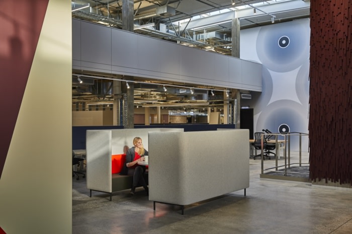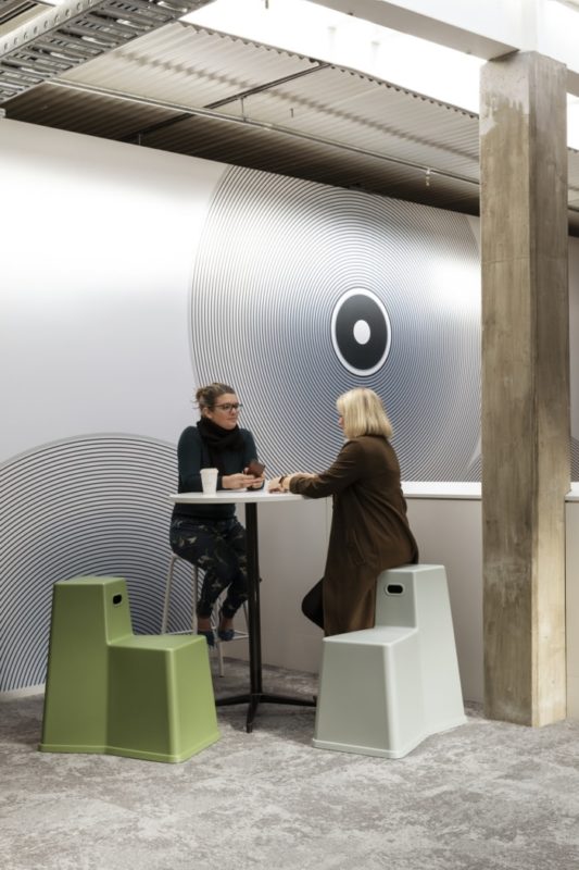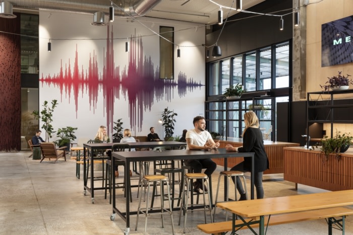The interior is transformed into a ground floor and mezzanine level layout with spaces creating ‘hoods’ that use the architecture of the broadcasting studio suites as bumpers between brands, building a cityscape which presents like an urban masterplan. The suites are paired or stacked with each neighbour tribe characterised with feature wall cladding treatment or imagery which references sound, a visual manifestation of auditory sensation that creates perpetual energy and drama.