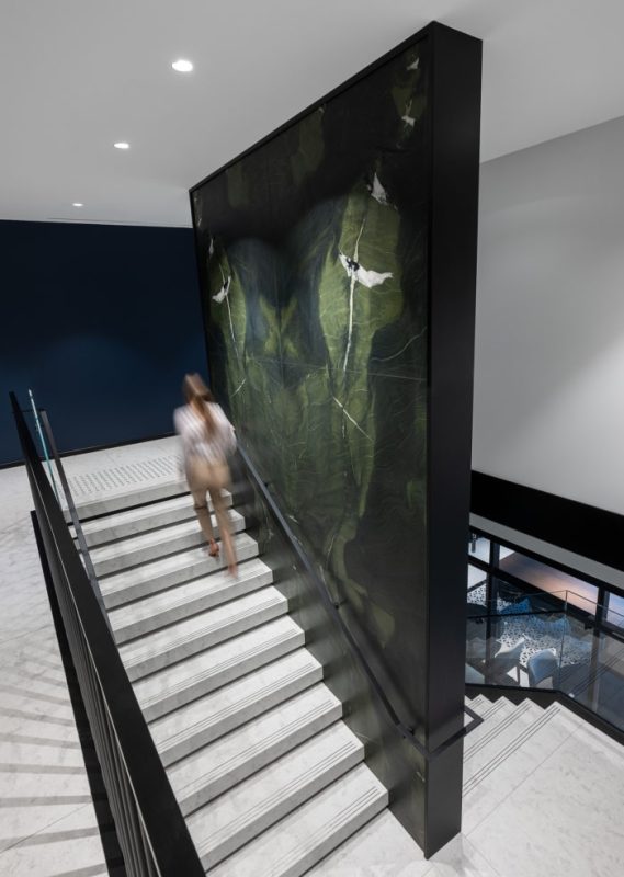 One of the biggest design moments is the dramatic feature wall that rises behind the smooth quartz staircase just off the café, joining the 12th and 14th floors and creating a stunning visual connection. Finished in Avocatus marble, the installation expresses movement and life, with deep veining that evokes images of butterflies, petals and flying birds. Threaded bars extend the full height between the floors, reinforcing the cohesive feel of the design.