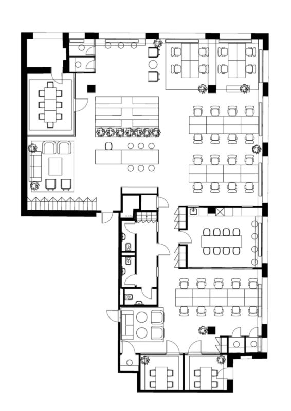 Functionally, it was requested to place: a reception and a communication area, working desks, lounges, places for a focused work. The kitchen and restrooms technically were to be placed at the center of the office. The main hall with a combined furniture arrangement scheme was placed along the windows, separated from the main hall by a wide corridor and plants. The variety of functional areas allows the team to choose different scenarios each time.