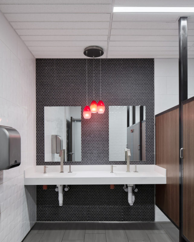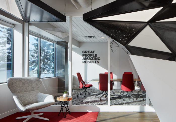 The office layout is enlivened by open areas that allow daylight to penetrate deep into the space and provide views to the outdoors. Internal gathering spaces are marked by tessellating clouds consisting of both perforated dark metal and backlit panels, a continued reminder of the company’s manufacturing expertise.