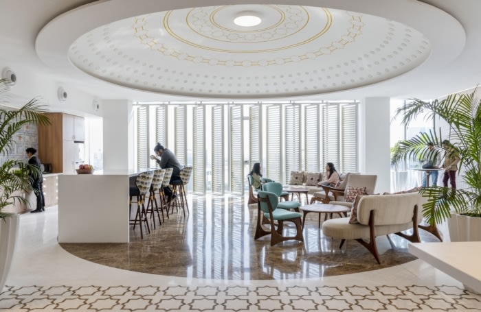 What sets the space apart from regular corporate work spaces is the historical context it draws from. Bathed in ivory white and punctuated with jaali work (a Mughal architectural style of perforated stone or latticed screen),arches, and domed ceilings, the IDC Noida campus’ architectural reference points, inspired by one of the world’s biggest architectural wonders, the Taj Mahal, are hard to miss. This is true that incorporating Mughal art and architecture impressions into a modern corporate office setup was quite challenging. Microsoft was extremely keen that the grandeur of the Taj Mahal and richness of the materials be brought into its Noida office. We took this as a challenge and in the brainstorming sessions of our creative team, we decided to take it a step further and bring into the office design not only the textures, elements like arched entrances, peitra dura, flooring patterns and intricate jaalis, but also its unique setting on the banks of the river Yamuna.