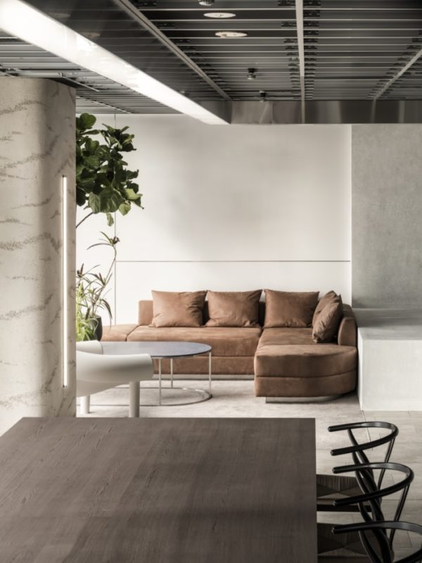 Different office style was required for the design of the new business of the well known Japanese company. The space had to differ from the usual office space, where usual atmosphere would be for the people to work at their desk. In the context of several projects and group of people working together at the same time, the aim was to make people from different teams feel like sharing a single space. The entire office is a large open space with a large sunken sofa area that is positioned in the center, where the workers can spend their time as they like and work as they prefer – either on the large sofa, desk area or corner coffee table with a view of the city.