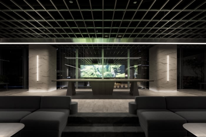 The point was to create an office where people can truly relax and spend their time in freedom, in the essence of feeling in their own house which was taken into inspiration and applied to all common spaces, such as living or dining environment. To create a place, where people can feel the future, technology in the interior that embraces everyday life has been used as a way of expressing newness. In a space filled with natural light, the high-resolution, high-output images flowing in the center of the office add a sense of light to the space. By blurring the boundaries between the image and the reality, I IN aimed for an expression that symbolized the true future. The walls, pillars and kitchen counter are finished with a plaster material with a soft texture, adding gentle atmosphere to the space, while emphasizing the boldness of the solid materials.