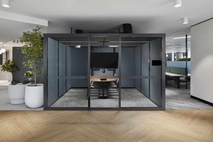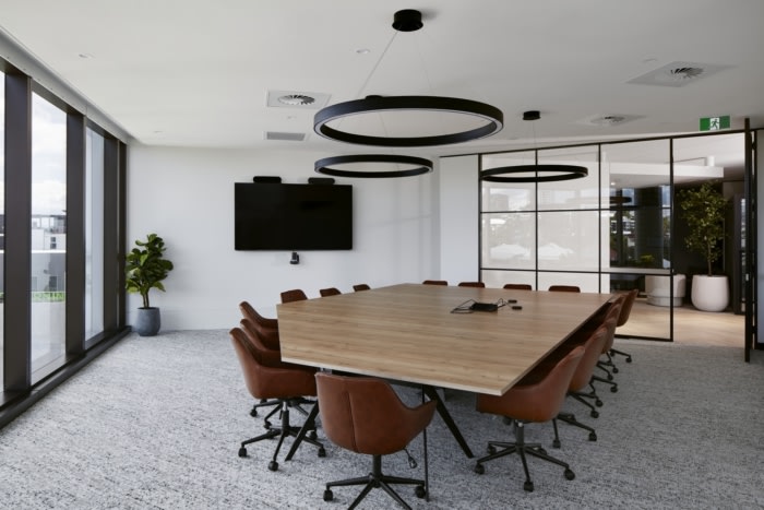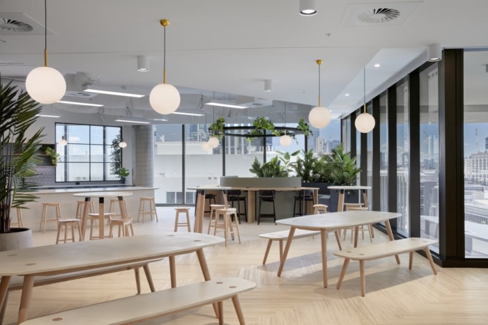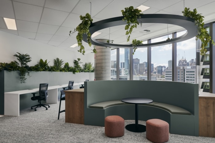 These offices are designed with an abundance of greenery, circular planters suspended from the ceiling, and birch timber slat walls that create a perfect balance of colour and light. The pumice, copper tones, sage greens, charcoals and soft greys work together to create a calming atmosphere which is essential for any workplace.