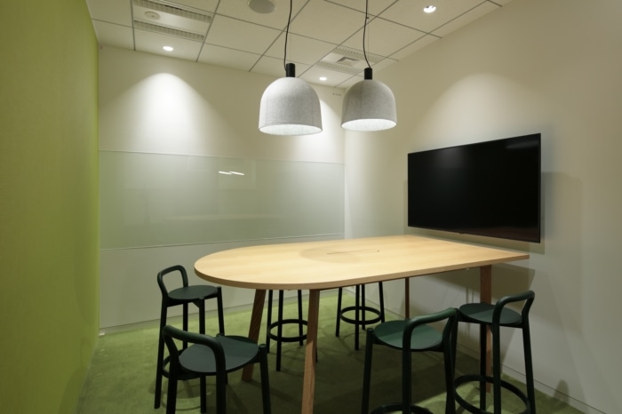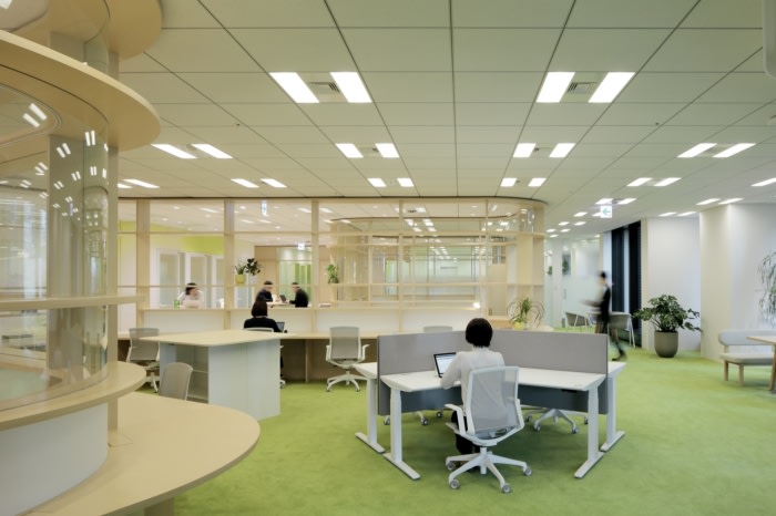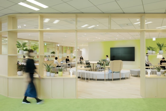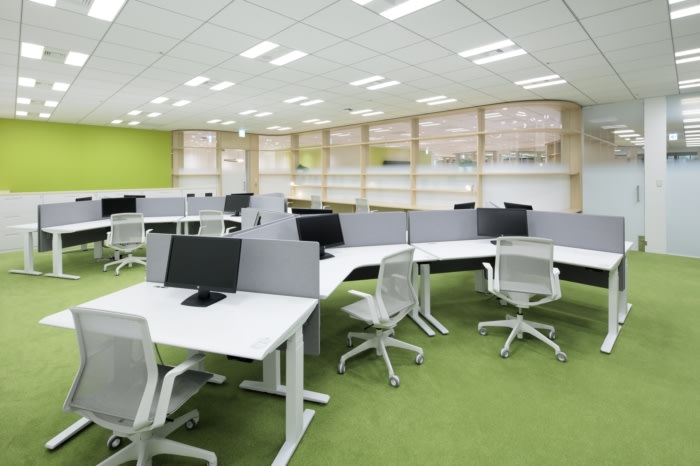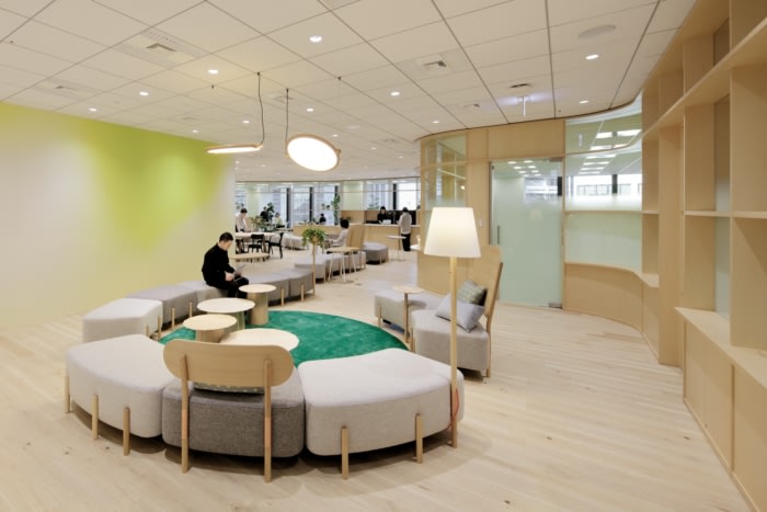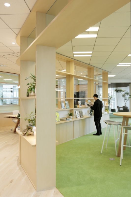 Key to the design is a unique serpentine glass-paneled wall of shelving that undulates around a central communal area to delineate three encompassing office corner zones. Gradient frosted glass above the shelving is used to partially obscure the offices but ensure a seamless visual flow between the spaces. Texture and a natural color palette are also used to divide zones, where oak veneer flooring in the communal area transitions to lawns of green carpeting in office spaces. It is a unique “Shelf” arranged in a meandering way . On the shelf, gradated glass, transparent glass , and glass-free areas are systematically placed to act as information barriers, and the information security level is controlled to create a visually seamless space. At the same time, we have created spaces of various scales, such as places where people naturally cross their gazes as they walk , creating conversations. oak flooring,The office space on the window side has a green carpet like grass, and the space is divided by texture and natural colors.
