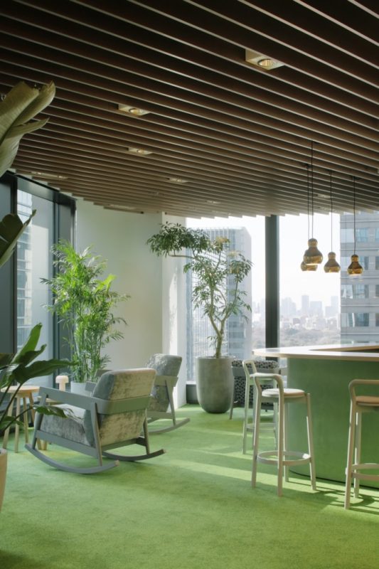 Within the main MONE office area sits the unusual heart of the design — a window-walled corner bar, furnished with low rocking armchairs facing views of the Imperial Palace below. Defined by deep green carpeting, overhead wooden louvers and low hanging amber pendant lamps, it exudes extra warmth — a space of pure relaxation that can be sectioned off by a wall of curtain. Like much of the MONE Group Office design, it remains a flexible space, a counter to work at during the day transforming into a cozy gathering space in the evenings.