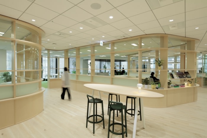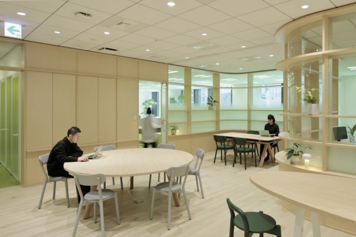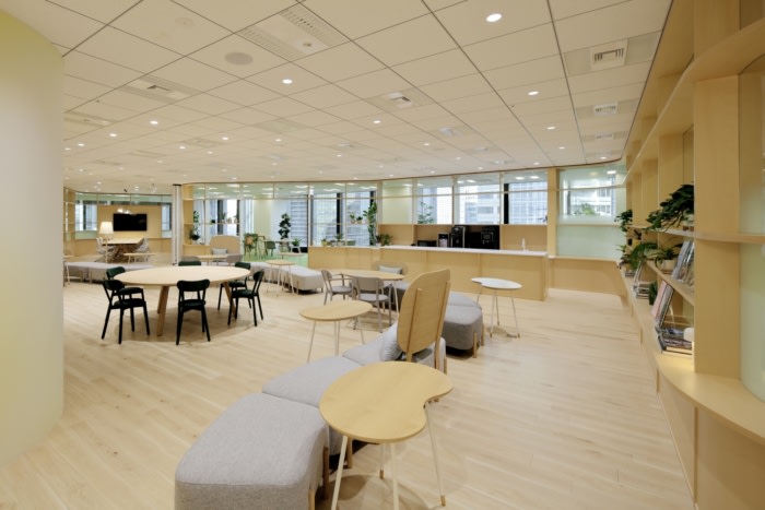 Inside the communal area, soft aesthetics of rounded furniture echo the curvilinear shelf wall and encourage face-to-face communication. Curved fawn dora dora modular seating, KDa’s collaboration with Karimoku, winds its way around a plush circular green rug and hugs side tables. Elsewhere, larger wood-toned tables are round or oval, and a minimalist corner coffee bar and counter serve as another casual meeting point. Each employee is asked to adopt and enjoy caring for one of numerous potted plants that bring the therapeutic benefits of nature into the space.