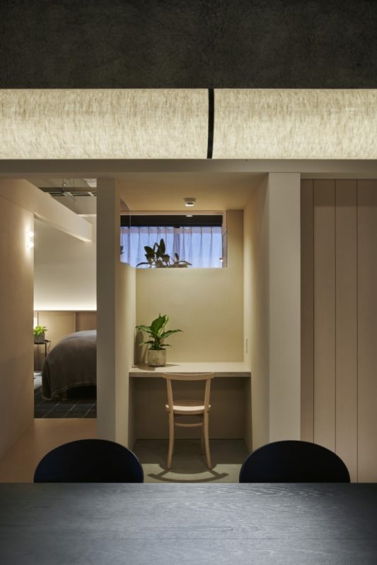 The entire space was considered as one large living space, with a spacious dining area (office area) surrounded by a living room by the window, a bedroom, and a living room by the window.