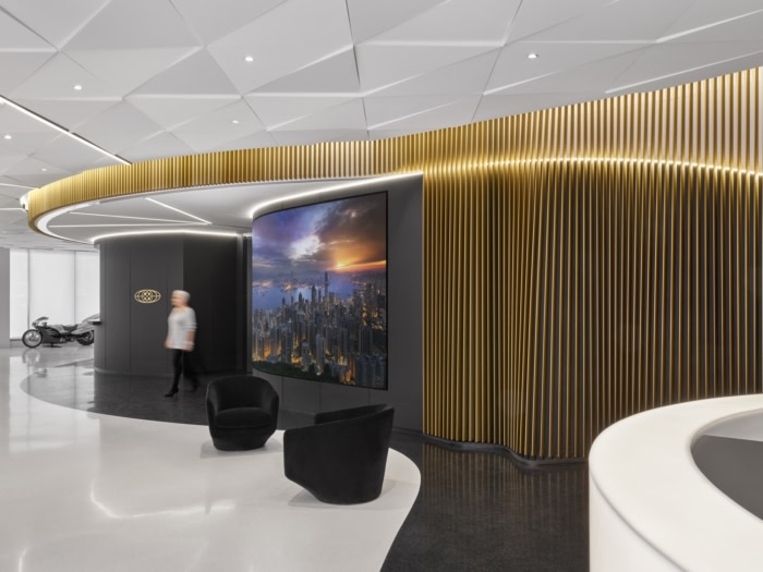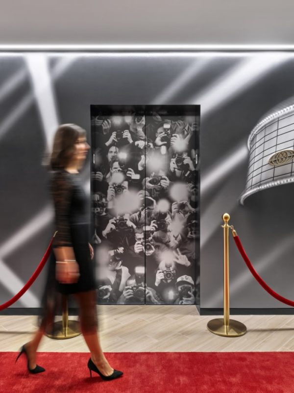 Drawing from the experience of a Hollywood premiere, the anticipation is just as important as the main event. The building’s transparent first floor connects to the streetscape and draws people into the pre-function hall.Inspired by fluidity and movement of old film reels, the team’s goal was to create a singular dynamic design that ties program spaces together, which include reception desk, theater entry, concessions and hospitality zone. A black and white backdrop provides the stage for Hollywood elegance and modern day technology to meet through a 145-foot curved champagne metal wall that replicates the movement of curtains. The architectural drapery is fabricated with undulating milled metal fins that lift to unveil a curved digital screen showcasing movie previews and dramatic fluted black and gold theater doors.To help support the large crowds, a custom acoustical stretched fabric ceiling carries throughout the hall with integrated lighting that pulsates to indicate the start of the show.