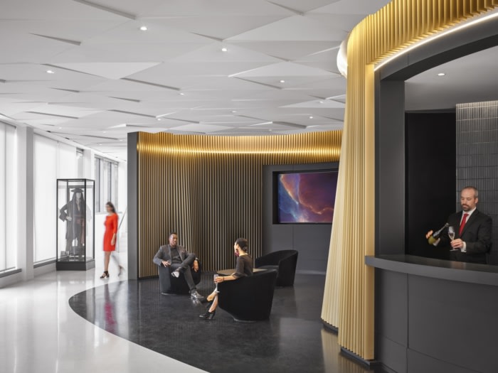 At the heart of this project, the 118-person state of the art theater is equipped with a Dolby Atmos sound system billed by Dolby as “the most significant development in cinema audio since surround-sound,” powered by 41 speakers and six subwoofers. To focus viewers towards the entertainment, two fluid lines of light comprised of classic theater inspired sconces and linear coves cuts through fabricated fins to showcase the screen. The champagne and wood fins provide a warm, holistic screening experience. For a more intimate occasion, the front rows are anchored by amber colored mohair seats, creating a special front row view for VIP guests.