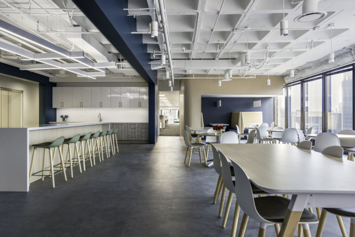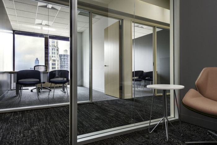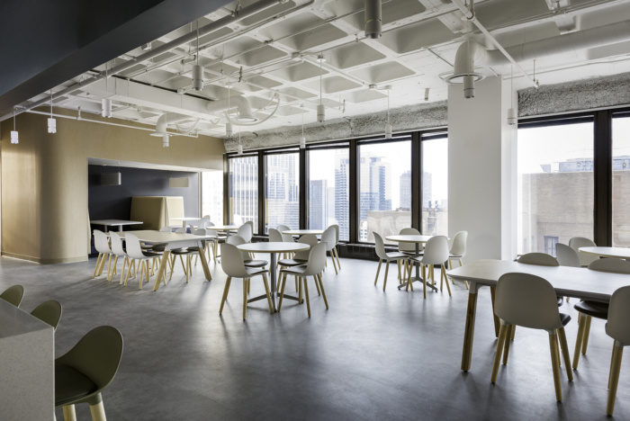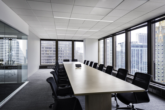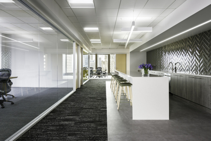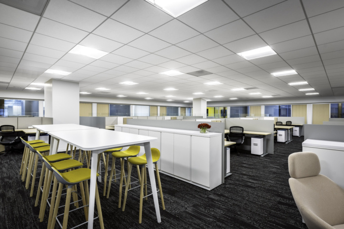INTERFORM Architecture + Design and Corporate Concepts, worked with the client to develop a comprehensive solution that re-shaped the work environment for every user. After careful study, the project team recommended complete installation of perimeter glass walls, maximizing daylight for all. Lower furniture panels, and cohesive layouts emphasize and enhance teamwork. Ergonomics are supported with adjustable height workstations and new seating, in a crisp modern palette. The previously combined lunch and copy/storage areas were separated, and a prime spot on the floor was dedicated to a new Café space with sweeping views of the lake. This room functions as a vibrant community area, and a variety of dynamic furnishings allow both individual work and informal small group meetings.