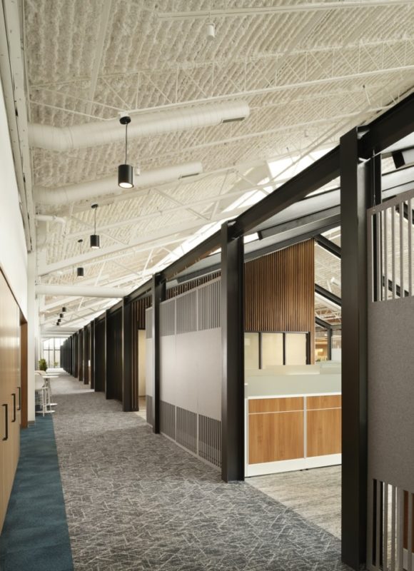 - Restoration of a dramatic interior skylight that spans the entire depth of the building – a key feature that is a major element of the building’s past, now a renewed driver and symbol of Northpointe’s future and organizational datum on which the entire space is organized