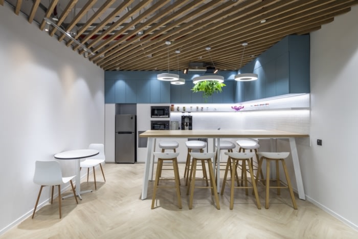 AK Interiors designed an on-trend, fluid and future-proofed work hub for the company’s young and energetic employees. With the aim of creating flexibility, the architects developed various functional work setups that provide both privacy and transparency through the space. A key aspect of the design is the acoustic correction, especially in the open space areas. Suspended sound-absorbing panels were installed in the open ceiling in the informal area and amphitheater, making sure the activity in the working areas will not be disturbed by the informal activities. Transparency and luminosity alternating with blue chromatic accents comfort the visitor at his entrance and lead him inside the working spaces.Huddle up for the team meeting!