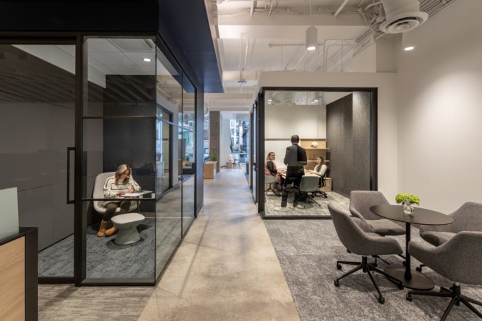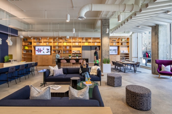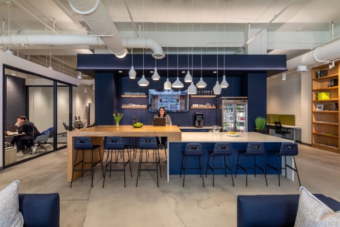 The multifunctional space was designed to serve as a showroom for its marquis brand, Teknion, but inherently offers much more than simply a showroom experience. The expansive floor to ceiling windows wash the space with natural light, and the bustling street views naturally activate the glass storefront. Bold use of a rich navy hue, visually anchors the central architectural element of the space, providing backdrop to the oversized bar, immediately inviting you into the main living area. A curated selection of ancillary products greet you in the front half of the space, providing a “choose your experience” menu of social seating options. A bar height community table offers easy collaboration, lounge seating invites comfortable conversation, and the central, oversized bar invites guests to gather around to enjoy drinks and conversation together for a variety of social events. No matter your vantage point, the finish palette of the space feels cohesive, fresh and relevant. The natural wood tones warm up the exposed concrete elements, and contrast the deeply saturated navy walls, providing a tailored, yet comfortably edgy aesthetic.