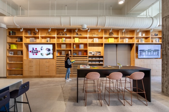 A beautiful, oversized white oak wood library wall doubles as a showpiece for Office Revolution’s sister company, Custom Crafters, while neatly housing finish samples and organizing project selections.